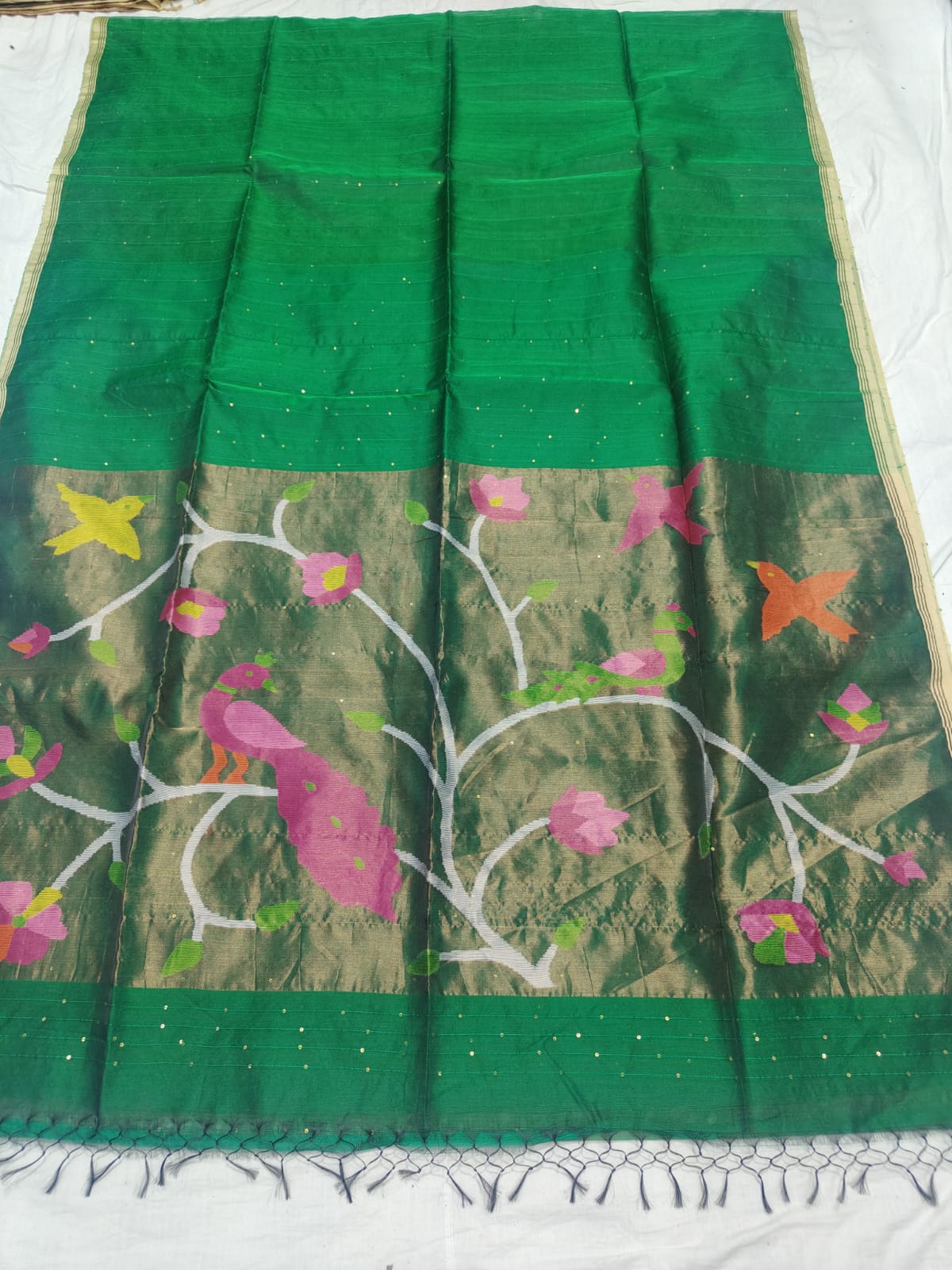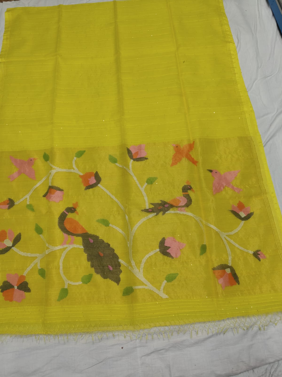 ✨ π“žπ“­π“±π“ͺ𝓷𝓲 – A luxurious blend of heritage weaving and contemporary shimmer. This Muslin Silk Pathani Weave Saree features a beautifully detailed anchal crafted with traditional silk weaving techniques, enriched with all-over sequin work that adds a graceful festive glow. Known for its feather-soft drape and elegant fall, the muslin silk body enhances comfort while offering a premium, radiant finish.