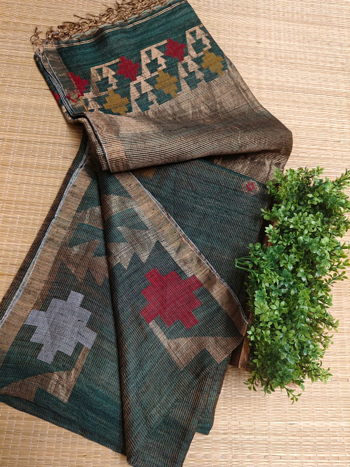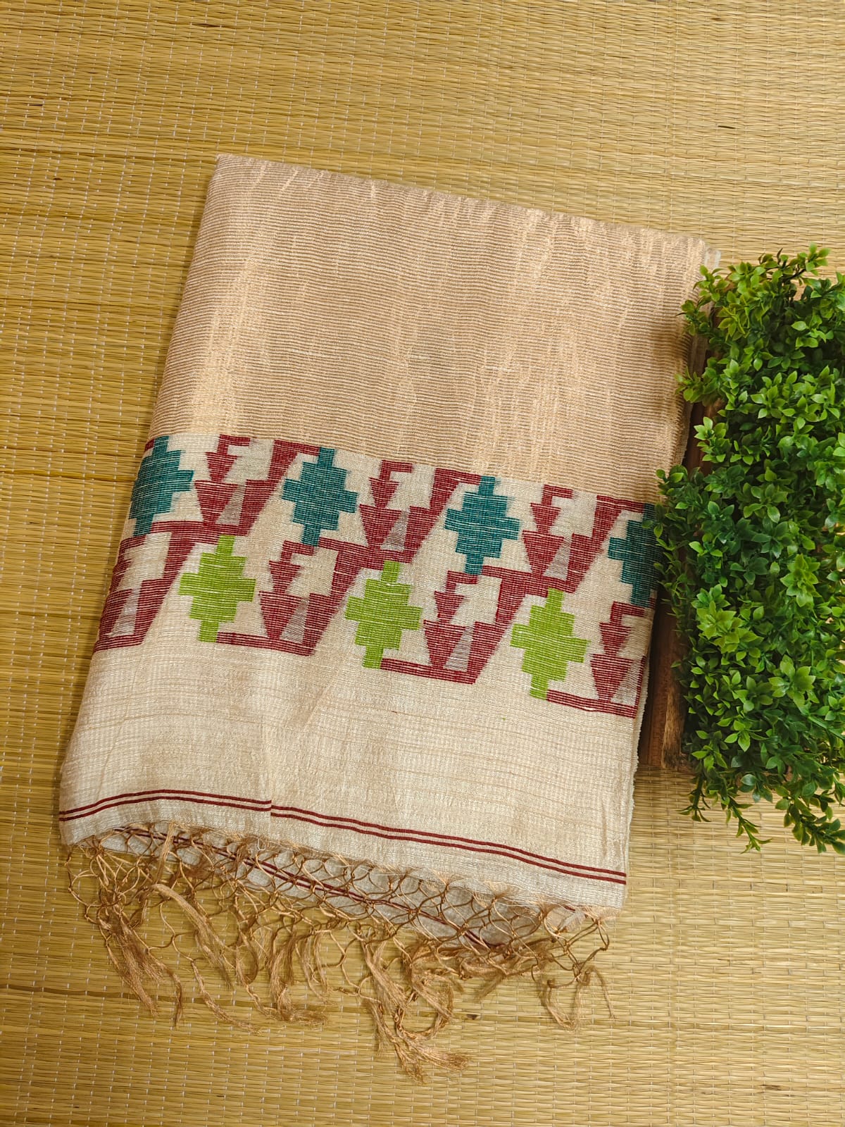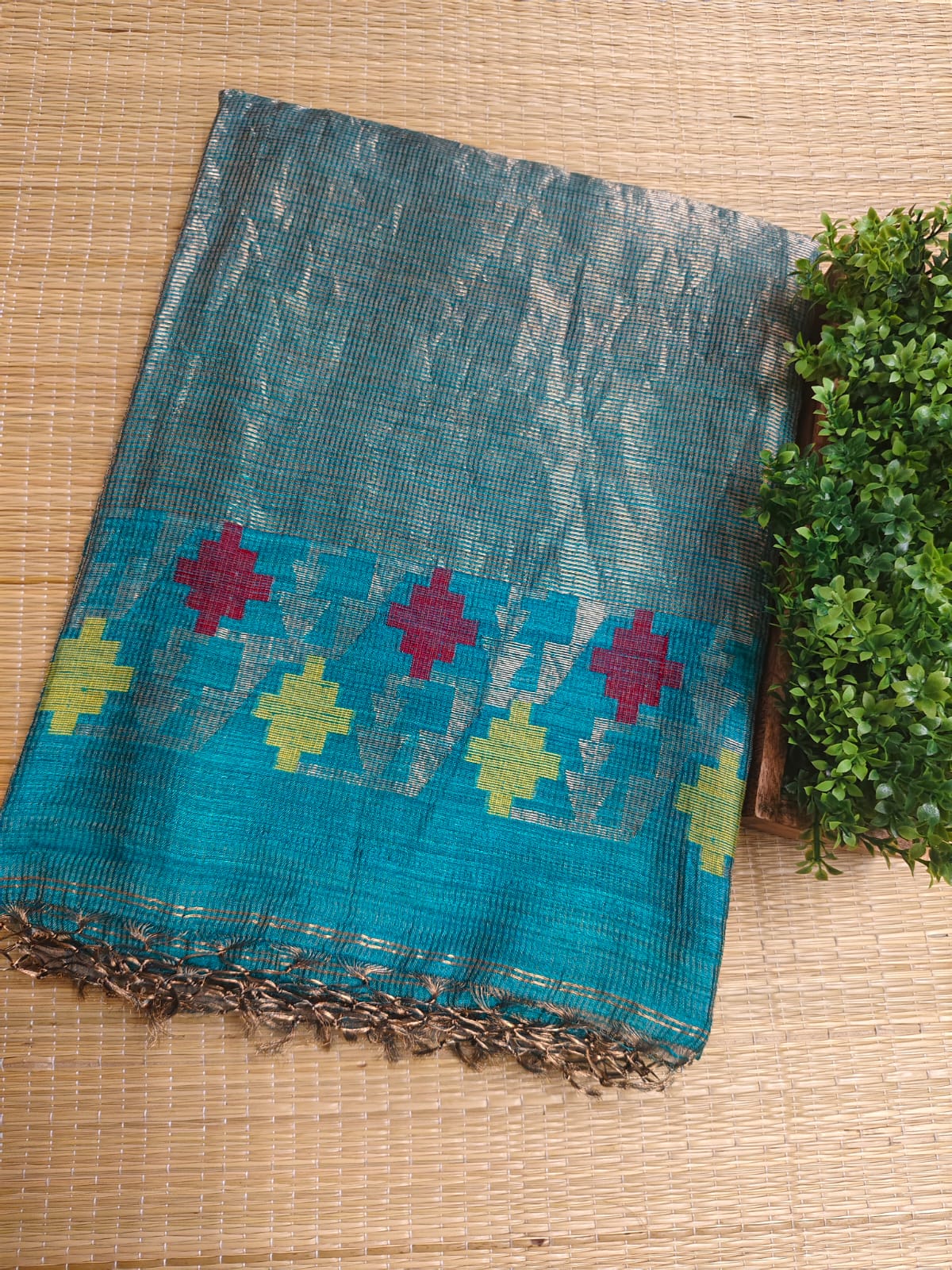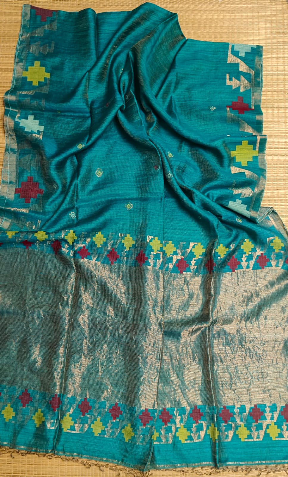 Experience the elegance of handwoven luxury with The Tussar Needle Jamdani, crafted from pure authentic Matka Tissue and detailed with fine needle Jamdani weaving. This saree blends tradition with a modern, shiny finishβperfect for premium festive and wedding wear.